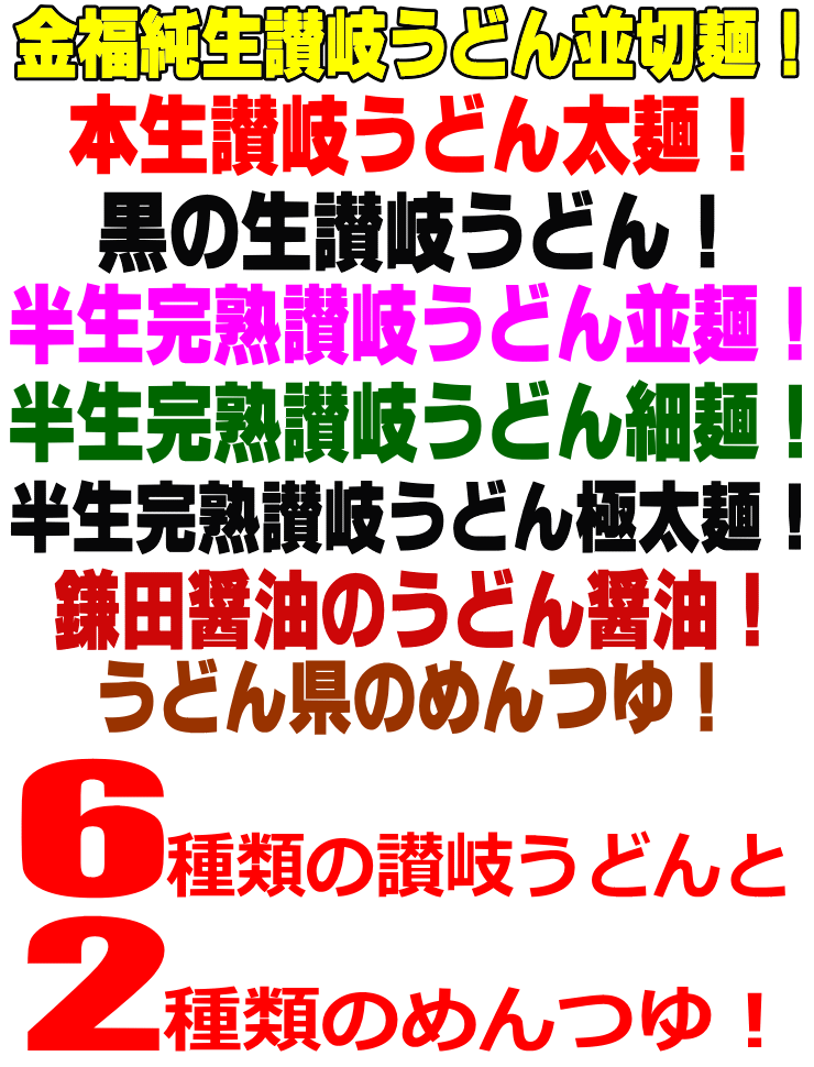 ギフト対応 名 称 大満足バラエティーセット12人前(讃岐うどん) 原材料名 ■完熟讃岐うどん・極太麺、並麺及び細麺 小麦粉(ASW、讃岐の夢2000)、食塩、加工澱粉、酒精 ■純生・生太・黒の生讃岐うどん 小麦粉(ASW)、食塩、加工澱粉、酸味料、(アルコール、醸造酢) AUS産全粒粉10%使用 ■鎌田醤油うどん醤油 本譲造醤油、糖類、味醂、食塩、アルコール、さば節、鰹節、こんぶ、調味料、(原材料の一部に大豆、小麦を含む) ※保存料は不使用 ■堺屋醤油うどん県のめんつゆ 本譲造醤油、果糖ぶどう糖液糖、食塩、砂糖、鰹節、そうだかつお節、昆布、たん白加水分解物、煮干粉末、醗酵調味料、そうだかつお節、さばぶし、醸造酢、調味料(アミノ酸等)(原材料の一部に大豆、小麦を含む) 内容量 ■金福純生讃岐うどん・並切麺 1袋250g×1袋(2人前) ■本生讃岐うどん・太麺 1袋300g×1袋(大盛2人前) ■黒の生讃岐うどん 1袋300g×1袋(大盛2人前) ■完熟讃岐うどん・極太麺 1袋250g×1袋(2人前) ■完熟讃岐うどん・並麺 1袋250g×1袋(2人前) ■完熟讃岐うどん・細麺 1袋250g×1袋(2人前) ■鎌田醤油製うどん醤油(小袋) 1袋20ml×6袋(6人前) ■堺屋醤油製うどん県のめんつゆ(希釈用) 1袋20ml×6袋(6人前) 賞味期限 以下全て常温■完熟讃岐うどん極太麺・並麺・細麺 約45日 ■純生・生太・黒・生讃岐うどん 約35日 ■鎌田醤油製うどん醤油(小袋) 約11ヶ月 ■堺屋醤油製うどん県のめんつゆ(希釈用) 約11ヶ月 保存方法 直射日光を避け、常温で保存してください。